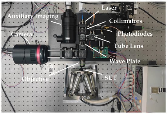 The experimental device is shown in Figure 7. At the output of the fiber laser (LP642-PF20, 642 nm, 20 mW, Thorlabs, Newton, NJ, USA), a collimator (F810FC-635, NA = 0.25, f = 35.41 mm) was used to collimate the beam. The outgoing beam conformed to a Gaussian distribution with a beam-waist radius of 3.2 mm. The collimated beam passed through a beam splitter, quarter-wave plate (WPQ05ME-633, Ø = 1/2”, Thorlabs, Newton, NJ, USA), and an objective (LMPLFLN 20×, NA = 0.4, f = 9 mm, Olympus, Tokyo, Japan), and converged on the surface of the plane mirror (GMH-11, HYGX, Guangzhou, China). The plane mirror was supported by a six-axis displacement platform (H-811. I2, ±10, Power Integrations, San Jose, CA, USA). After the reflected light re-entered the microscope, it was divided into two beams by a beam splitter lens. A beam of light entered a complementary metal-oxide semiconductor camera (QHY600Pro, 9576 × 6388 × 3.76 μm, Light Speed Vision Technology, Beijing, China). The other beam was focused through a flat-convex lens (LA1207-A, Ø1/2”, f = 100.0 mm, Thorlabs, Newton, NJ, USA) and divided into a prefocus and postfocus measurement beam by a beam splitter, and then, respectively, injected pinholes with approximately 650 μm of defocusing. We added an auxiliary imaging device that helped identify the focal plane of the sensor during device tuning. A six-axis displacement table was used with a minimum motion increment of 2.5 μrad and repeatability of ±2 μrad; these technical characteristics met the experimental 2D tilt angle requirements.