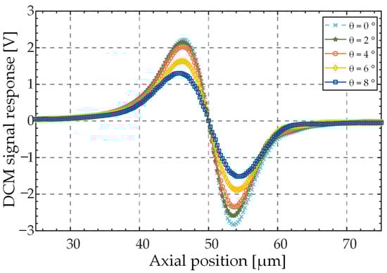 A slower scanning speed can make the sensor stay near the focal plane for a longer time, thus reserving extended exposure time for the camera, whereas longer camera exposure times can facilitate the capture of spot images with stronger contrast; however, the deviation of exposure position range from zero-crossing results in a reduced ability to predict tilt angle. Thus, considering the use of high-speed real-time scanning in 3D detection, and the fact that the camera only allows a short exposure near the zero-crossing of the differential signal, the exposure time of the camera was set to 40 μs, travel of the differential probe was set to 50 μm, and the axial scanning speed of the six-axis platform was set to 1 mm/s. After the acquisition of a full period of the differential confocal signal, the data in the linear region (the slope was estimated based on the data within the range of 50% of the zero-crossing) were used for linear fitting. The intersection point of the fitted line and time axis was taken as the true value of the zero-crossing time. Figure 8 shows the collected differential signals at different tilt degrees, θ. In the range of θ from 0° to 8°, 100 sets of differential signal curves were collected for each set of θ in increments of 0.1°. The experimental results showed that the average prediction error of the zero-crossing time using the zero-crossing prediction algorithm based on the sliding window was 17.63 μs, and the corresponding axial defocus was 17.63 nm.