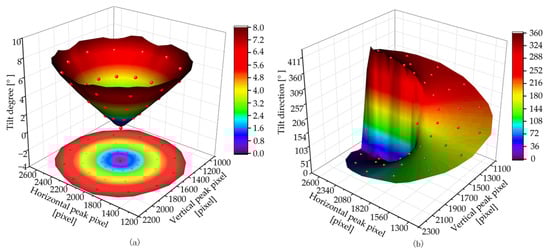 The FSC algorithm was used according to the training set to extract the peak position and establish the relationship between the peak position of the light spot and the tilt angle of the tested surface. Using the partition-fitting polynomial fitting method [15], surfaces determined by the relationship surfaces between the peak position and (a) tilt degree θ and (b) tilt direction φ were fitted, as shown in Figure 10.