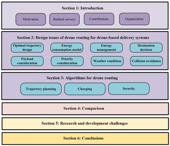 This survey consists of seven sections, as shown in Figure 2. Section 2 discusses the major design issues of drone routing for drone-based delivery systems. In Section 3, the existing drone routing algorithms are classified into trajectory planning, charging, and security algorithms and, next, each of them is extensively reviewed to provide the readers with a clear view of the operational principles and characteristics of drone-based delivery systems. In Section 4, we compare the drone routing algorithms in terms of their advantages, limitations, main idea, and innovative features. In Section 5, we discuss open issues and challenges for future research and development. Finally, the conclusions of this review are drawn in Section 6.