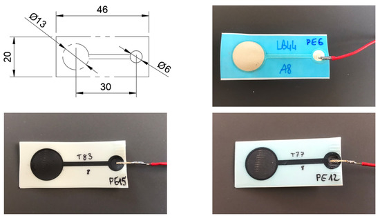As previously mentioned, the electrodes were manufactured on three different materials using the same printing and transferring technologies, developed by CEA LITEN—Innovation Laboratory for New Energy, Technologies, and Nanomaterials. All the sensors present the same form factor, as detailed in Figure 1 and are printed on an extremely thin and flexible film, allowing for the comfortable and versatile integration of these sensors in wearables. This can contribute to reducing the skin–electrode impedance and motion-related artifacts, as the electrodes better adapt to the body [37].