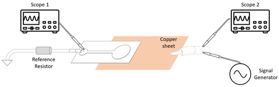 The signal generator (Wavegen 1) applied the signal to the DUT through a copper sheet, whose resistance was negligible, and a probe measured this (Scope 2). A known reference resistor, of a similar order of magnitude as the DUT, was connected in series and the voltage across this was measured with a second probe (Scope 1). By measuring the voltage at both ends of the DUT, the impedance analyser was able to deduce the current flow, the voltage across, and the phase between the two. In these measurements, the signal generator was set to output a sine wave with 100 mV of amplitude (200 mV peak-to-peak), while the scope swept the frequencies from 1 Hz to 5 kHz, with 100 measurement points per decade, which were evenly distributed in a logarithmic scale.
