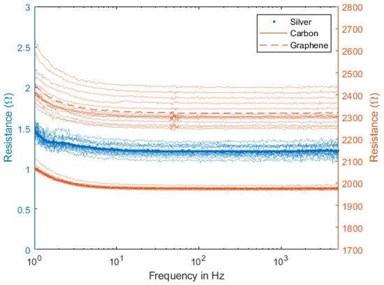 The impedance response of the materials was measured according to the methods described above, and the results are shown in Figure 4. If there is a clear difference between the mean nominal values of each material, with silver presenting values between 1 Ω and 2 Ω, carbon between 1800 Ω and 2000 Ω and graphene between 2200 Ω and 2500 Ω, the impedence value’s dependency on the frequency is clearly similar to every set of electrodes. This is especially noticeable in the range of frequencies below 100 Hz, where the impedance decreases with frequency. These results are in line with previous studies, which show that the electrical behavior of such electrodes is similar to a resistor in parallel with a capacitor: at lower frequencies, the overall impedance is set by the resistor alone, whereas, in the upper spectrum, the capacitor effect takes over, thus reducing the value of the global impedance [11,26,40,43,44,45]. This is particularly relevant for most biosignals, where the bandwidth of the signals under study is below 200 Hz [46,47].