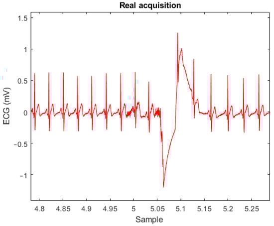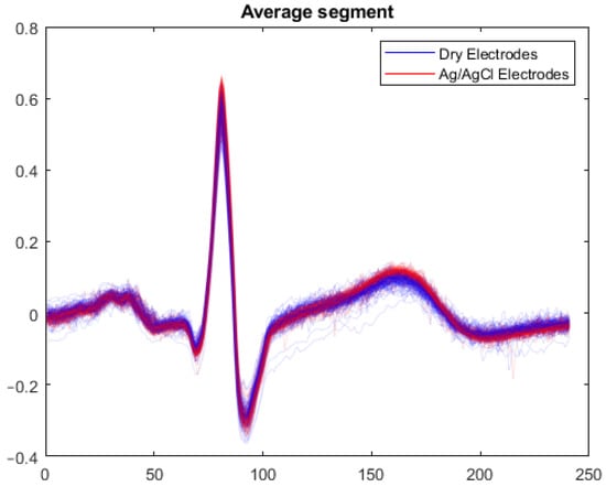 Before applying these metrics to the signals acquired, they were segmented in portions to remove the largest artifacts present, due to factors such as the positioning of the electrodes, accidental touches, body movements and others. An example of the artifacts present during an acquisition is presented in Figure 5. Then, the segments were further sampled beat-by-beat. This was carried out by detecting the R-peaks of the QRS complex in each segment and then applying a window of 600 ms around the peak (200 ms before and 400 ms after). Extracting the QRS complex by windowing it is necessary to perform the above-mentioned morphological comparisons with all the important ECG features used for the diagnosis of different arrhythmia (R-R interval, S-T segment, T wave amplitude, …) [51,52]. In Figure 6, the superposed QRS complexes extracted according to this methodology show how the dry electrodes are able to give the same average signal as the gelled electrodes without compromising the small features. The RMSE and CS were then calculated for each beat, providing a beat-by-beat comparison of the obtained signals. The results obtained by these metrics are summarized in Table 3.