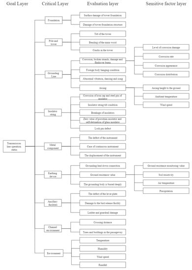 The overhead ETL status evaluation guide divides the ETL into foundation, tower, grounding wire, insulator string, connector, grounding device, auxiliary facilities, and channel environment. The eight-line element specifies the possible states of each line element. The hierarchical structure model is employed to evaluate the ETL’s operation status, including 8 primary indices and 57 secondary indices.