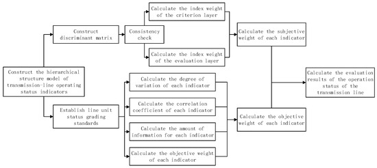 Maintaining the safe and stable operation of the power system largely depends on the operating status of electricity transmission lines (ETLs) according to relevant industry standards [1,2,3,4,5]. These standards specify the ETL state grades, calculate the score for each grade based on the field-measured data to construct different ETL state quantities, and then obtain the evaluation results. Popoli et al. proposed a reasonable evaluation method that takes into account the influence of non-uniform soil resistivity along the line on the operating state of the line. The results of this method are also relatively accurate, but there is a strong subjectivity [6]. Due to the continuous expansion of the grid scale and improved intelligence, it is not viable to scientifically and comprehensively evaluate the operating conditions of ETLs using only industry standards and the evaluation of single state quantities in the operating state of power systems and ETLs. Adriano M. Junqueira defined several indicators through the AHP, which were combined with a geographic information system (GIS) to determine five types of sensitivity maps, and then to monitor, analyse, and warn of environmental risks to ETLs based on the determined regional and dynamic meteorological and hydrological data [7]. Malhotra proposed a risk-based approach for evaluating and selecting ETL design guidelines in the United States in the event of disruptions caused by hurricanes. The results show that ETLs with longer lines are more economical than with shorter lines [8]. Shafaei et al. proposed a highly effective evaluation method called the Monte Carlo method to evaluate the lightning performance of ETLs [9]. It has been proven that the BP neural network method can assess the damaged faults of ETLs [10], but the model’s computational speed does not meet the requirements of real-time analysis. To address the limitations of these methods, Papia Ray et al. studied the fault type and distance estimation scheme based on a support-vector machine in long ETLs. The forward feature selection method extracts redundant features from the matrix and normalises them. In this way, the variables of the simulation situation dramatically improve the accuracy of ETL fault judgment [11]. While the results are promising, this research is still in its early stages. Additionally, the high-level analysis methods based on the Delphi, questionnaire survey, and expert scoring methods have a significant subjective influence [12,13]. To reduce the personal impact of the evaluation, a method using Bayesian networks has been proposed as a new expert system evaluation approach to evaluate the operation status of ETLs and prove its feasibility [14,15]. There are few studies assessing the operation state of overhead ETLs, so there are still gaps in many aspects [16,17]. Schaefer et al. and Allahvirdizadeh et al. [18,19] introduced an MCDM-based approach to evaluate the performance objectives for the strategic management and development of an energy cloud based on a survey on cloud computing of smart grids. This brings a managerial approach to discussing the objectives, such as resilience, availability, and reliability, in relation to the development of future energy systems, in which ETLs will continue to play a leading role as crucial support points for the new distributed energy systems. Furthermore, according to a previous literature review, the existing research methods are not highly effective, due to the influence of subjective factors. Therefore, it is necessary to study a comprehensive evaluation method that is unaffected by emotional factors [20,21].