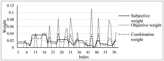 The complete weight calculation results for each index and the comparison of different weights can be seen in Figure 3. Using the subjective weight and objective weight values for each index and Equation (9), the comprehensive weight value for each index is calculated: