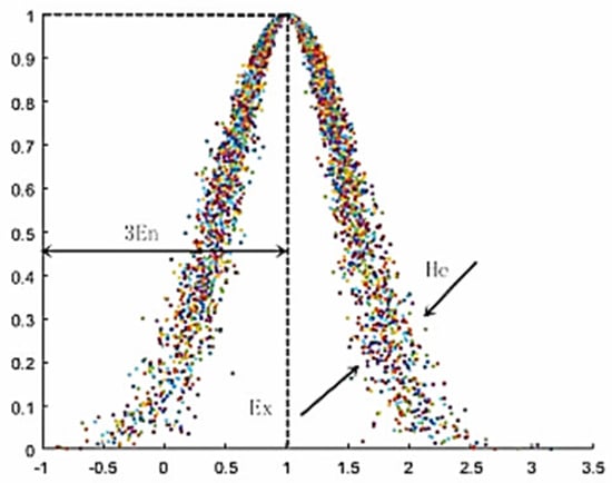 Compared to the fuzzy set theory that is currently commonly used, the application of cloud model theory in evaluating ETL status can utilise the advantages of randomness while accounting for ambiguity [45,46]. In this research, qualitative and quantitative indicators can be transformed into one another. The cloud model proposed in this study is an image composed of numerous “cloud drops”. When the level of blurriness is high, the merged image appears similar to a “cloud”, and when the level of blurriness is low, the combined image appears like a “curve”.