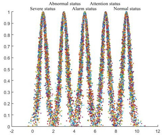 The early warning levels of the ETL’s operating status are divided into five groups: normal, attention, alarm, abnormal, and severe. Furthermore, the generated ETL operating status standards are entered into the evaluation cloud model, and only the operation status index evaluation cloud and comprehensive evaluation cloud of the ETL [41,42,43,44] need to be determined, after which the state early warning analysis can be conducted.