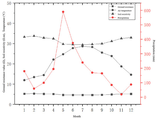 The results of the study showed in Figure 8 that there were noticeable increases in precipitation and temperature from February to June, resulting in decreases in soil resistivity and ground resistance, and these values reached their minima in July and August. Precipitation and air temperature began to decrease gradually from June to November, while soil resistivity and ground resistance gradually increased, reaching their maximum values in December and January. It appears that the ground resistance exhibits a clear trend of change with seasonal changes, and it is positively correlated with soil resistivity changes and negatively correlated with temperature and precipitation changes. The monthly minimum values of earth resistance and soil resistivity generally occur in summer or autumn when there is high precipitation and temperature, while the maximum values occur in winter when the precipitation and temperature are low.