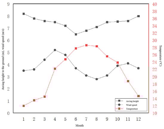 The health status of the arc of the grounding wire was taken as the main measurement standard, based on the characteristics of the variation of the arc. To ensure timeliness, the distance from the arc to the ground was used as the main evaluation index for the health status of the arc of the grounding wire, with air temperature and wind speed serving as auxiliary evaluation indices in Figure 9. The influence of air temperature, wind speed, and wind direction on the arc height was analysed using MATLAB simulation software. The results showed that as the air temperature and wind speed increase, the sag of the arc becomes larger and its distance to the ground decreases. According to the analysis results, combining these results with the characteristics of seasonal climate change, it was found that in the summer—when temperatures are higher and wind speeds are lower—the height of the arc from the ground reaches its trough in the monthly average trend for the year. In the winter, when temperatures are lower and wind speeds are higher, the height of the arc from the ground reaches its annual peak in January. In Figure 10 the trend of peaking and then valleying, and then valleying and peaking again, indicates that although temperature, wind speed, and sag are negatively correlated with ground height, the influence of temperature is significantly greater than that of wind speed.