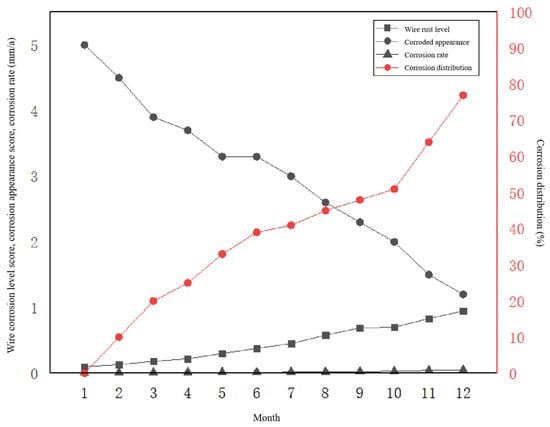 Annual variation curves of corrosion degree, corrosion rate, corrosion appearance, and corrosion distribution of the wire.