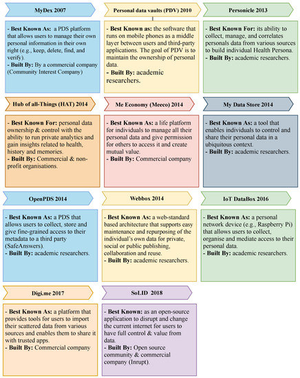 Many PDS platforms have developed over the last two decades. While some of these platforms were built by commercial companies and the open-source community, others were developed as research projects. Each of these platforms has focused on specific features to help grow and adopt the user-centric model. In the following, we will discuss the development of these platforms as depicted in Figure 3.