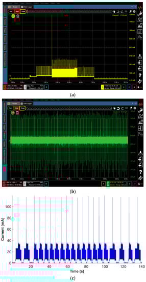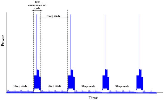 Table 4 summarizes the energy consumption measured with the lab-design system and the CX3324A current waveform analyzer shown in Figure 12 and Table 3. The results presented in Table 4 have been calculated by averaging the energy consumption of 20 BLE communication cycles, resulting in ELoad, 1 communication cycle = 0.110 J for the lab-design system and ELoad, 1 communication cycle = 0.113 J for the high-performance CX3324A current waveform analyzer, the total energy consumption in one communication cycle.