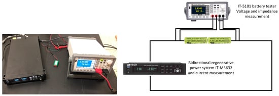 Figure 4 shows the experimental setup implemented in this work to analyze the behavior of the rechargeable battery pack. The charge and discharge experiments were performed using a bidirectional regenerative power system (IT-M3632, 800 W, 60 V, 30 A, ITECH, New Taipei City, Taiwan) connected to the two terminals of the battery pack. This instrument measures and records voltage and current with an accuracy of ±0.1% and 0.1% + 0.1% FS, respectively. Simultaneously, a battery tester (IT-5101, ITECH, New Taipei City, Taiwan) was used to measure the voltage and internal impedance of the battery with an accuracy of ±(0.01% + 0.01% FS) and ±(0.4% + 0.05% FS), respectively. The measurements of the voltage and impedance of the battery from the tester were synchronized with a computer using a Python code programmed by the authors of this work.