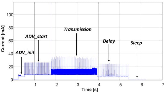 This section presents two systems to measure the very low energy consumption of the analyzed IoT device. Since this device communicates cyclically with a gateway, the energy consumption has a cyclic profile consisting of five modes, advertising parameter initialization, advertising start, transmission, delay, and sleep, as shown in Figure 5.