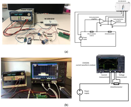 To evaluate the accuracy of the measurements made with the lab-design system, a current waveform analyzer (CX3324A, 1 GSa/s, 14/16-bit, 4 Channels, Keysight Technologies, CA, USA) with two current probes (CX1102A Dual Channel, ±12 V, 100 MHz, 40 nA–1 A, Keysight Technologies, Santa Rosa, CA, USA) and one passive voltage probe (N2843A, Keysight Technologies, Santa Rosa, CA, USA) was also used to measure the energy consumed by the SmartConnector, which is shown in Figure 6b.