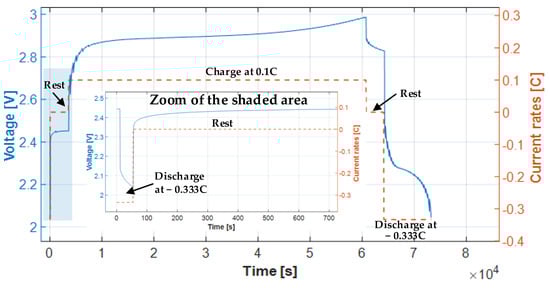 As shown in Figure 7, the two cells were discharged at a constant rate of 0.333It, from an initial voltage of around 2.45 V down to 2.0 V. They were then rested for 1 h, and then charged at a constant current rate of 0.1It for 16 h (the charging time specified by the manufacturer, as shown in Table 1) to around 3 V. After another rest of 1 h, the rated discharged capacity Cn was obtained by discharging the cells at a constant rate of 0.333It to reach the end-of-discharge voltage (2 V).