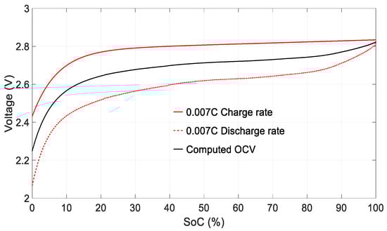 The open circuit voltage VOCV of each cell can be obtained from measurements, averaging the charge and discharge curves obtained at very low charge and discharge rates as a function of the SoC. In this way, the effects of hysteresis and ohmic resistance are minimized [19,28]. The method developed by Plett [28] was applied to obtain the VOCV shown in Figure 8. First, the cells were fully charged at 0.05 C. They were then discharged to the end-of-discharge voltage (2 V) at a rate of 0.007 C (0.007 C = 0.007 × 2 A = 0.014 A). Once discharged, they were charged at a rate of 0.007 C until fully charged. Next, the VOCV curve was obtained by averaging the charge and discharge curves at a rate of 0.007 C, as shown in Figure 8.