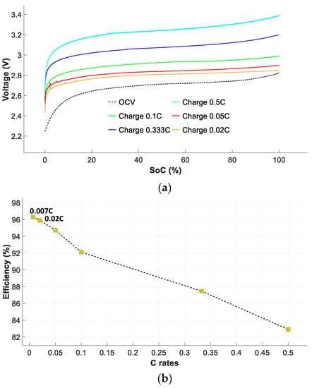 Knowing the rated capacity Cn and the VOCV–SoC curve, it is possible to determine the efficiency of the battery during the charge and discharge cycles, as well as the overall efficiency from (6), (10) and (12), respectively. To acquire the curves shown in Figure 9 and Figure 10, the cells were first fully charged or discharged at a rate of 0.05 C, and then discharged or charged at different C rates to obtain the voltage curves as a function of the SoC. Figure 9a shows the battery voltage versus SoC during the charge cycle, while Figure 9b shows the charge efficiency versus the C rate.