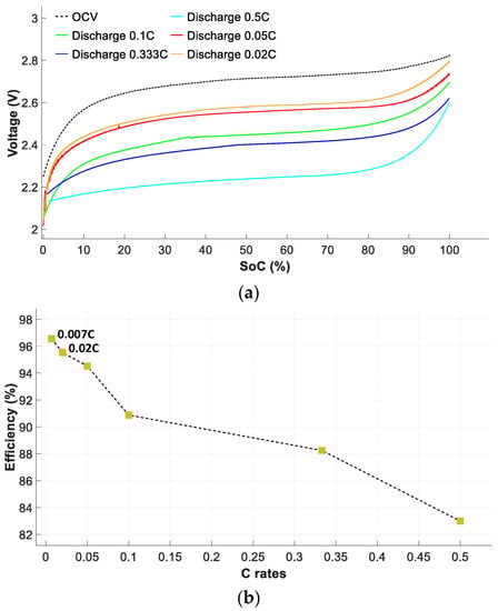 Figure 10a shows the battery voltage versus SoC during the discharge cycle, while Figure 10b shows the discharge efficiency versus the C rate.