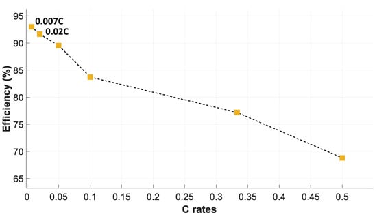Finally, Figure 11 shows the charge and discharge energy efficiency of the battery pack. It is seen that the overall battery efficiency can be as high as 93% at a rate of 0.007 C, thus decreasing at higher C rates. In this case, the overall efficiency during the charge and discharge cycles has been calculated from (12).