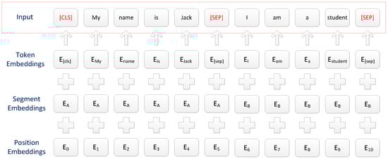 The characteristics of the BERT pre-training language model have been introduced above. For a given token, the input layer representation is constructed by adding token embeddings, segment embeddings, and position embeddings. The advantage of this model is that it could learn more comprehensive vocabulary and semantic information and resolve ambiguities. The input representation of BERT is shown in Figure 2.