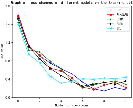 It can be seen from Figure 7 that although the convergence speed of this model is slower than other models, as the number of iterations increases, the loss value of this model is lower than the other four models. Among the first four iterations, the GRU benchmark model has the fastest convergence speed. The model applied in this article reached the lowest loss value in the eighth iteration, and the loss value was still the lowest in subsequent iterations. The reason for the slow convergence of the model is that the trainable parameters of the model are larger than those of other models. Therefore, after a certain number of iterations, this model will show its advantages.