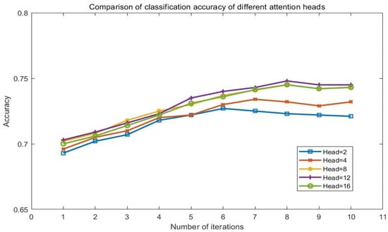 The number of heads of the MSA mechanism is also an important parameter that affects the performance of the model. In order to explore the influence of different Attention heads on classification, this article conducts experiments on the Yelp 2015 dataset and utilizes the model in this experiment with the different values of Attention mechanism heads (2,4,8,12,16). The experimental results are shown in Figure 8.