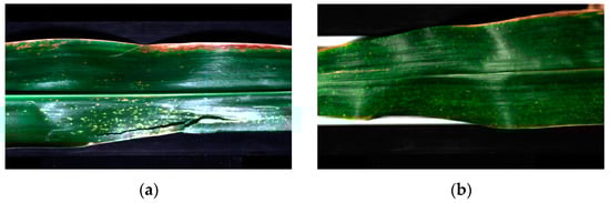From 11–15 August 2021, 100 samples of each of the two diseases (anthracnose and brown spot) of corn leaves were collected in Northeast Agricultural University’s experimental field. Both diseases occurred naturally, as shown in Figure 1. The collection time was in the corn filling period; at this stage, corn needs to absorb a lot of nutrients and water to meet the needs of grain development. Poor ventilation and light in the field can easily cause various diseases, including corn anthracnose and brown spot, which are two diseases that are very easy to occur.