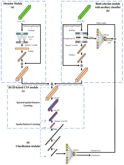 Y–Net architecture. (a) Attention module; (b) Band selection module with auxiliary classifier; (c) 3D–2D hybrid CNN module; (d) classification module.