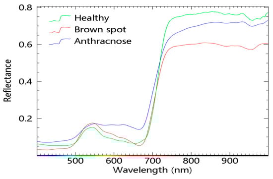 Mean spectral profiles of healthy corn leaves and corn leaves with anthracnose and brown spot.