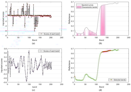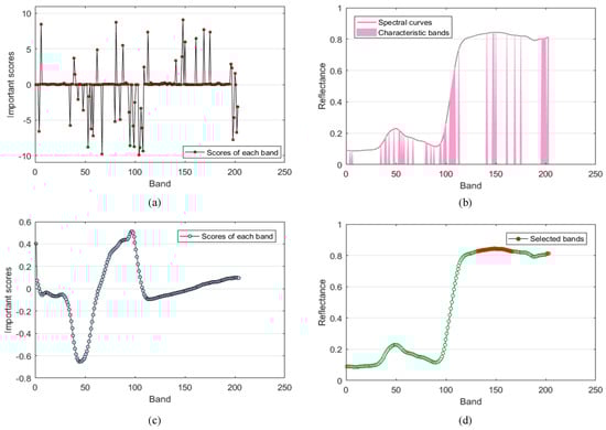 Results of feature band selection. (a) The importance score of each feature channel calculated by the Y–Net band selection module. (b) The region of the spectral curve where the feature band extracted by the band selection module is located. (c) The magnitude of the regression coefficients of each band by PLS calculations. (d) Feature bands by SPA selection.