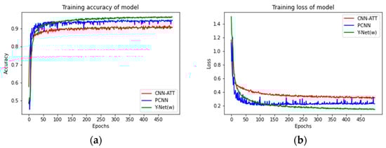 Figure 8 shows each model’s variation in accuracy and loss function values. As can be seen from the graph, the accuracy increases rapidly, and the loss values decrease rapidly in the first few epochs of each model. As the network continues to be trained, the network gradually stabilizes. As can be seen from Figure 8, the Y–Net(w) model is more accurate than the PCNN and CNN–ATT models. The specific accuracy rates are shown in Table 2. The model of CNN–ATT achieved a classification performance of 0.9081. The model of PCNN achieved a classification performance of 0.9444. The Y–Net(w) model achieved an accuracy of 0.9653, which was 0.0572 and 0.0209 higher than the CNN–ATT model and the PCNN model. The results show that the Y–Net(band)–(Y–Net(w)) achieved better classification performance compared with 1D–CNN and 2D–CNN. The superiority of the 3D–2D hybrid CNN used in this study was verified.