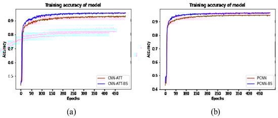 Accuracy comparison before and after the addition of the band selection module. (a) Accuracy of CNN–ATT before and after adding the band selection module; (b) accuracy of PCNN before and after adding the band selection module.