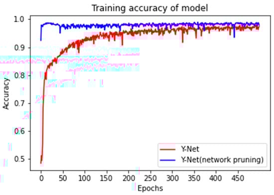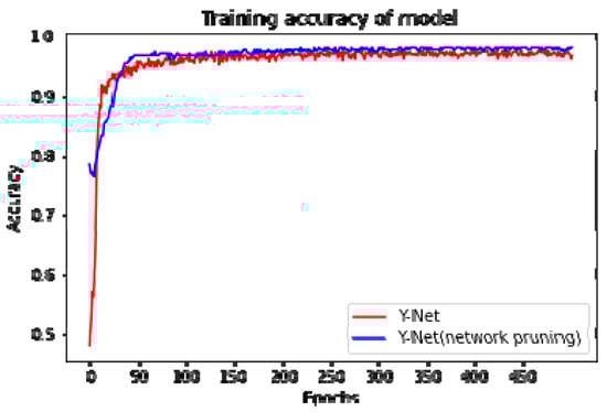 Network pruning removes certain unimportant parts of a CNN while maintaining the performance. Depending on the object of deletion, pruning can be divided into weight pruning, which removes unimportant weights in the CNN, and neuron pruning, which removes unimportant neurons in the CNN []. This study focuses more on the magnitude of the weights, so weight pruning was used. The results after pruning are shown in Table 3 and Figure 10. Figure 10 shows that before pruning, the network was trained using the full band and achieved an accuracy of around 97.37. When pruned, the accuracy of the network was basically stable at around 98.34. It can be seen that the network pruning removes redundant parameters that do not contribute significantly to the accuracy of the results. Not only does it not affect the accuracy of the model, but it also improves it slightly. In the band selection module, bands may be pruned when the weights are zero or close to zero so that those bands that are not significant are removed. Thus, the computational complexity of the subsequent modules is reduced, and the pruned network is retrained to escape the probability of the previous local minimum and further improve accuracy. Table 3 shows the Y–Net before and after network pruning, which reduces the model size to 1/3 of the original size and improves the model accuracy by 0.0097.