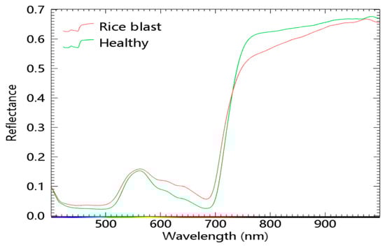 The spectral characteristics of a healthy green plant depend mainly on its foliage. In the visible spectral band, the spectral properties of plants are mainly influenced by chlorophyll. The absorption valley is due to chlorophyll’s strong absorption of radiant energy in the blue band centered at 450 nm and the red band at 670 nm. The reflectance and transmittance of the leaves are very low, and the absorption between the two valleys is relatively reduced, forming a green reflective peak, referred to as the “green peak”, which is visually expressed as green. When plants grow healthily and are at the growth peak with high chlorophyll content, the “green peak” shifts to the blue light direction, while when plants “lose green” due to harm from diseases and insects or a lack of nutrients, the “green peak” shifts to the red–light direction []. The spectral action of green plants in the near–infrared band depends on the cellular structure inside the leaf. The spongy mesophyll tissue of healthy leaves is considered to be a good reflector for any radiation when all the space is filled with water and expanded. The gridded soft reticulate cellular tissue in mesophyll tissue absorbs blue and red light in visible light and reflects green light. When a disease attacks a plant, the water metabolism of the leaf tissue is impeded. After that, as pest damage increases, the plant’s cellular structure is damaged. The content of various pigments is reduced, leading to a reduction in the ability of the leaf to reflect near–infrared radiation. The spectral characteristics show an increase in reflectance in the visible region (400–700 nm) and a decrease in the near–infrared region (720–1100 nm). The near–infrared region is studied with a focus on the “red edge”, which is usually located between 680 nm and 750 nm. The position of the “red edge” moves along the wavelength axis depending on chlorophyll content, biomass, and phenological changes. When chlorophyll content is high, and growth is vigorous, the “red edge” is shifted towards the infrared; when plants are “losing green” due to pests and diseases or pollution or weathering changes, the “red edge” will move towards blue light [].