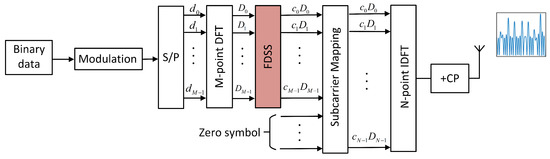 The FDSS-enhanced DFT-s-OFDM symbol can be implemented according to the framework shown in Figure 6. First, operate the M-point DFT on the modulation symbol sequence, i.e., . Then, multiply each term of DFT output sequence by corresponding Fourier coefficient, i.e., FDSS. Finally, operate the N-point inverse DFT (IDFT) on the shaped sequence padded with zero symbols. Accordingly, the FDSS-enhanced DFT-s-OFDM signal can be described as