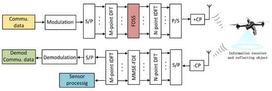 On the basis of Figure 2, an ISAC system based on FDSS-enhanced DFT-s-OFDM is shown in Figure 7. At the transmitter, the DFT signals are superimposed into a form similar to chirp pulses by weighting the DFT samples, which can realize the sensing and detection functions on the basis of the original communication model. The receiver uses a single-tap minimum mean square error (MMSE) frequency-domain equalization (FDE) to remove the impact of the channel. FDSS is applied between DFT and IFFT processes, which is essentially the shaping of frequency domain signals after DFT. Therefore, for the actual receiver, the FDSS coefficient can be regarded as a part of the channel frequency response and estimated through the channel estimation process [28]. In this way, the impact caused by the introduction of FDSS can be eliminated after MMSE-FDE. From this aspect, a typical DFT-s-OFDM receiver can demodulate the FDSS-enhanced DFT-s-OFDM symbol without any changes. In addition, if the FDSS coefficients are available a priori at the receiver, the receiver can perform better because they do not need to be estimated.