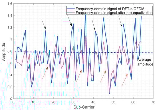 where is the compression ratio, and is the increase ratio. The frequency domain amplitudes of DFT-s-OFDM signal and the equalized signal are shown in Figure 8. Compared with the DFT-s-OFDM signal, the frequency domain amplitude of equalized signal become more uniform.