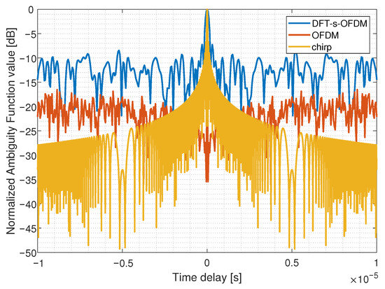Comparison of ambiguity functions among DFT-s-OFDM, OFDM and chirp.
