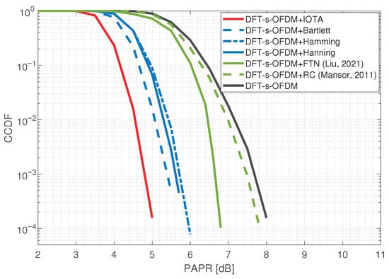 In addition, we also simulate the influence of FDSS on PAPR and BER performance. Under the condition of QPSK, we compare the proposed scheme with other FDSS filters such as Bartlett filter, Hann filter and Hamming filter, as well as methods used in other articles such as FTN [26] and raised cosine spectrum shaping [27]. The simulation results of PAPR performance are shown in Figure 16. It can be observed that FTN and RC shaping methods can obtain PAPR gains of 1 dB and 0.2 dB, respectively. The methods based on other filters can obtain PAPR gains of about 2 dB. The FDSS scheme based on IOTA can obtain PAPR gains of 3 dB. Compared with other schemes, FDSS-enhanced DFT-s-OFDM based on an IOTA filter has a better PAPR performance without a loss of sensing performance.