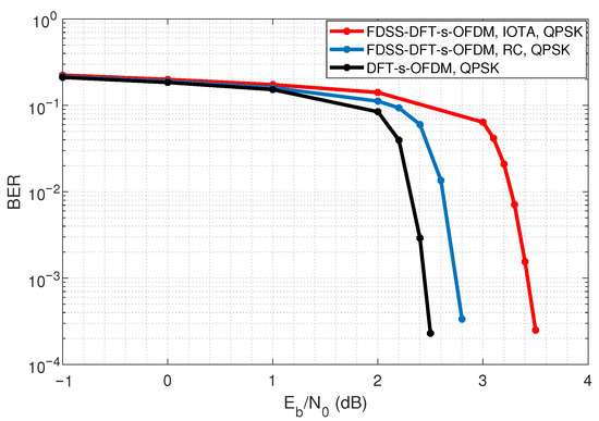 As shown in Figure 17, the introduction of FDSS in DFT-s-OFDM causes a certain degree of loss of BER performance. Under the condition of QPSK, the SNR loss of FDSS scheme based on RC is less than 0.5 dB, and the SNR loss of IOTA is less than 1 dB.