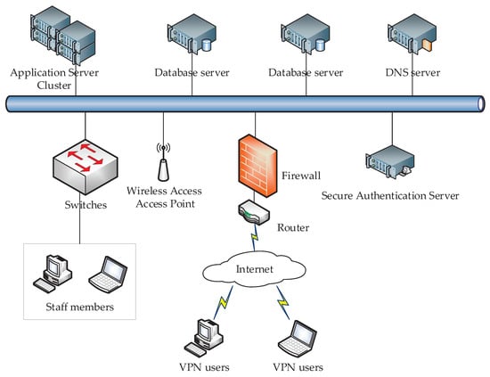 In terms of system network topology, the financial management platform network consists of a backbone network, a local area network (LAN) and a wide area network (WAN). The WAN enters the LAN through routers and firewalls for security screening to guarantee the security of the system platform. In most cases, staff access and operate the system from within the local area network. To meet some special cases where users cannot log in to the system within the LAN, the specific design provides a remote VPN login service to the system. The network topology of the financial management platform is shown in Figure 3.