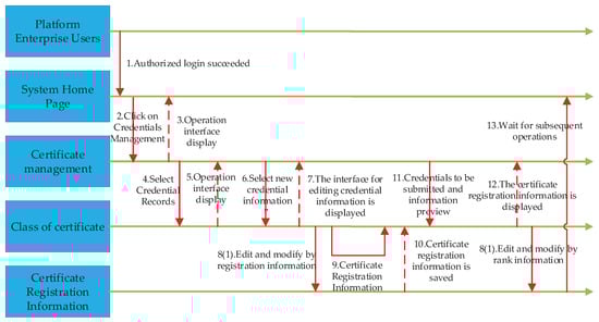 The real-name authentication sub-module consists of three core functions: real-name authentication information entry, information verification and payment password setting. All registered enterprises in the financial management platform need to undergo real-name authentication first, and they also need to undergo real-name verification through CFCA’s U-KEY and digital certificate [] each time they log in to the platform to verify the real identity of participating enterprises and to carry out online confirmation and signature verification. U-KEY and electronic signature use the CFCA digital authentication method. CFCA digital certificate is a piece of electronic data containing user identity information, user public key information and the CFCA digital signature. The digital certificate is the identity proof for all kinds of terminal entities and allows users to conduct information exchange and business activities online, ensuring the authenticity of the identity of both parties to online transactions, the integrity and confidentiality of information and the non-repudiation of transactions. Only if the participating subjects are authentic can we ensure the authenticity of subsequent operations on the platform.