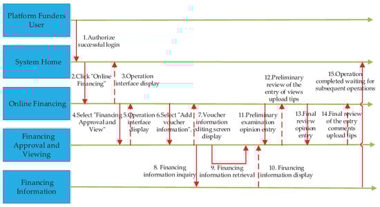 The financing approval and view sub-module mainly includes two sub-functions: financing view and financing approval. Using this module, you can approve and view financing. There are two levels of financing approval: preliminary and final. After the initial review is approved, it then needs to be approved by the final review. The status changes to pending final review and after the final review approval is passed/returned, the status changes to approval passed/returned. If the initial review is rejected, it directly changes to approval returned, and suppliers are alerted. For the financing application whose repayment method is billing financing, the interest rate and financing period need to be entered during the preliminary examination, and can be directly entered in the final examination after the preliminary examination is completed. The release of funds will be triggered after the final examination is passed. See Figure 5 for the design of the specific working time sequence of financing approval and viewing operation. As seen from the entire time sequence diagram of the financing approval and viewing operation, after entering the home page of the system, the platform’s fund users click on “Online Financing” and select “Financing Approval and Viewing”. They then enquire about their financing application information and then carry out the preliminary financing examination operation. After the operation is completed, they can enter the subsequent financing final examination operation.