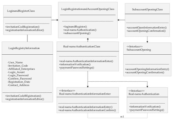From the detailed design content of the financial management platform, it can be confirmed that the entire login registration and account opening module mainly includes three sub-functions: login registration, real name authentication and sub-account opening. The specific login registration and account opening class diagram design is shown in Figure 7.