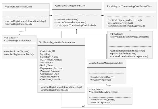 According to the detailed design of the financial management platform, the whole voucher management module mainly includes three sub-functions of voucher registration, voucher status management and voucher sign-in and transfer. The design of the specific voucher management class diagram is shown in Figure 8.