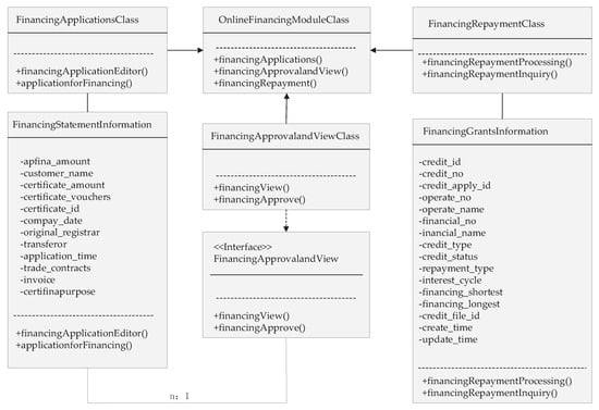 From the detailed design of the financial management platform, the entire online financing module mainly includes three major sub-functions: financing application, financing approval and view and financing repayment. The specific design of the online financing module class diagram is shown in Figure 9.