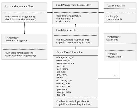 As a result of what was learned from the system requirements analysis, the fund’s management module is mainly used for the platform enterprise users to realize account management and top-up and withdrawal operations, for the enterprise funds users to realize automatic supervision of funds and funds flow and clearing operations. The fund management module mainly includes three sub-functions: account management, fund clearing and recharge and withdrawal.